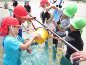 2本のホースを繋いで,消防士さんのような長ーいホースをつくって水を流そうと頑張る姿も・・・