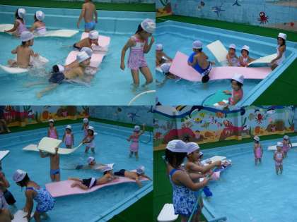 4歳児がプール遊びをしています。雨が上がってやっとプールに入って水遊びができました。みんなは大喜びでビート板に乗って遊びました。