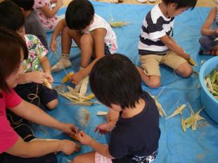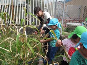 1学期に、年長組の子どもたちが、種から育てたポップコーンの苗を園庭の畑に植えました。夏休みの間に、ぐんぐんと大きくなり、収穫を楽しみにしていた子どもたち。自分の背の高さより大きくなったポップコーンを、友達と力を合わせて引っぱりました。皮をむいていくと、黄色い実がたくさんついていました。今年も、収穫した実をつかって、ポップコーン屋さんをする予定です。