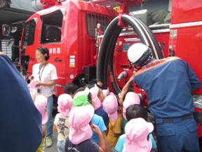 今日は、年中組、年長組の子どもたちが、消防署見学に出かけました。到着すると、消防士さんたちが笑顔で迎えてくださり、消防自動車の話を聞いたり、子どもたちの質問に答えてくださったりしました。ホースを出す実演もしていただき、消防士さんの、てきぱきとした動きに、「すごい!」と拍手。その後は、先生を乗せて、大きなはしご車が、グングン空に向かってあがっていきました。首が痛くなるほど、空を見上げ、「がんばれー」と手を振る子どもたち。無事に先生が降りてくると、ほっとした様子の子どもたちでした。消防士さんの話を聞いたり、身近で接したりして、今まで以上に憧れをもった子どもたちが多かったと思います。1学期から消防ごっこを楽しんでいたゆり組の子どもたちは、幼稚園に帰ると、早速、新しい消防自動車を積木でつくっていました。また、遊びが広がりそうで楽しみです。