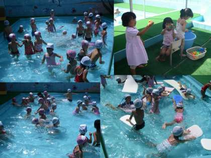 3歳児はプール遊びをしました。みんなでビート板に乗ったり、ビート板を丸めて中に入ったり、輪をくぐって遊んだりしていました。