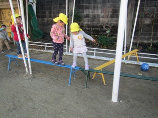 園庭のうんていのところでは,うんていに挑戦してみたい気持ちはあるものの,自分の力では難しいようで,いつも自分たちでゲームボックスを並べ足台を作って楽しんでいました。しかし,今日は平均台を並べて「たんぽぽ迷路」の完成です!友達同士で「うわぁ,落ちかけた…落ちたらチョコレート(土)まみれになる!」「これ楽しい!」と話しながら楽しむ姿が見られました。明日はどんな遊びをしようかな。楽しみだね!