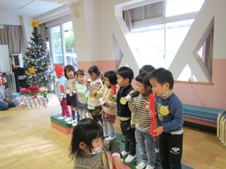 昨日,年長組の子どもたちが遊戯室で♪クリスマスコンサートをしていました。お客さんとして参加していた年少組の子どもたちは「今日はコンサートないのかなぁ。早く始まらないかなぁ」と,待ち遠しくてたまらない様子…。すると,今日は,年長組の子どもたちがサンタさんのおうちをつくり始めました。聞きつけた年少組の子どもたちは,さっそく見に行くことにしました。積み木でできた大きなおうちを見るなり「すごい!サンタさんのおうち!!」と,とても驚いていました。その後,昨日と同様に音楽を流してもらい,大喜び。自分でつくったマイクを持って嬉しそうに歌っていました。