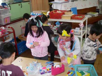 今日は朝から,折り紙を切ったりくるくる巻いて自分の指につけたり髪の毛につけたりしておしゃれをして,子どもたちは姫になりきっていました。「それ,かわいい!」と友達にいってもらい嬉しくなったAちゃんが「つくってあげるね」と友達の分まで一生懸命つくってつけてあげました。つけてもらった子どもは嬉しくなって,他の友達にも「見て見て!」と見せていました。みんな可愛くおしゃれをして,幼稚園中をお出かけをしたり,さくら姫のお城で遊んだりしていました。