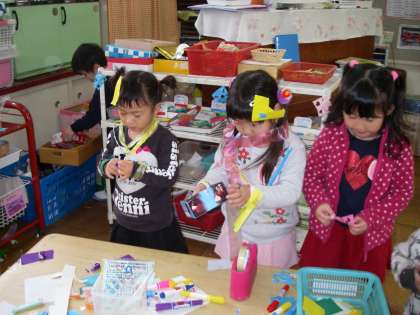 つくりながら「つくるのって楽しいよね〜!」「うん!楽しいよね〜!」と言い合っていました。遊びに必要なものを工夫してつくり,それを身につけてなりきって遊ぶ楽しさを十分に感じている子どもたちです。