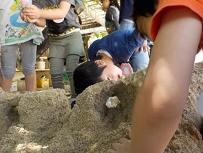 水や泥に触れる気持ちのいい季節になってきました。砂場では,トユを繋げて水を流したり,山や川,トンネルをつくったりしています。「こっちから水流すよー」「あっ来た来た!」「トンネル繋がったで」「向こう見えるかな」などと友達とやり取りして遊んでいます。