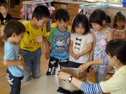 幼稚園で収穫したイチゴを使って,年中組がジャムを作りました。昨日から楽しみにしていたようで「ジャムつくんねんで」と嬉しそうに教えてくれる子どももいました。みんなでイチゴを揉んでつぶして,お鍋でぐつぐつ煮ていきます。甘酸っぱくて美味しいジャムができましたよ。