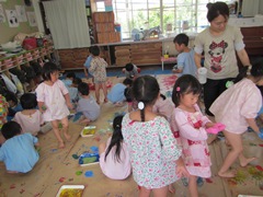 年長組は,保育室いっぱいに敷き詰めた紙の上で,絵の具を使って遊びました。手足を使って色を混ぜたり,大きな紙に塗りたくったりして楽しみました。たくさん遊んだ後は,使った道具や汚れた場所を力を合わせてぴかぴかにしました。