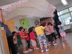 年少組は大きな布を使ってかくれんぼ遊びをしました。布の中にみんなで入って隠れていると,思いっきり布が引き上げられて「ばあっ」と子どもたちが顔を出しました。何度も隠れて出て,かくれんぼを楽しみました。