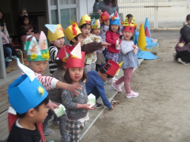 みんなのお腹の中にいる悪い鬼を追い出そうと豆まきをしました。