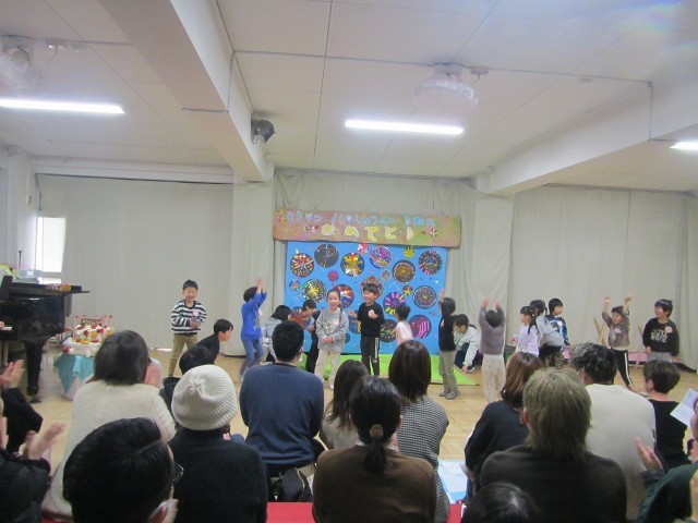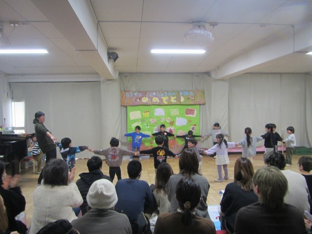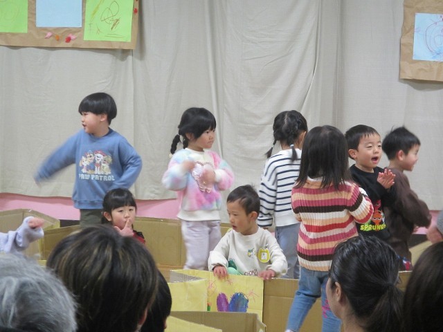 3歳児にとって初めての生活発表会。ドキドキを感じる姿もありながら、「先生と一緒って面白い!」ということをどの子も感じて遊びました。