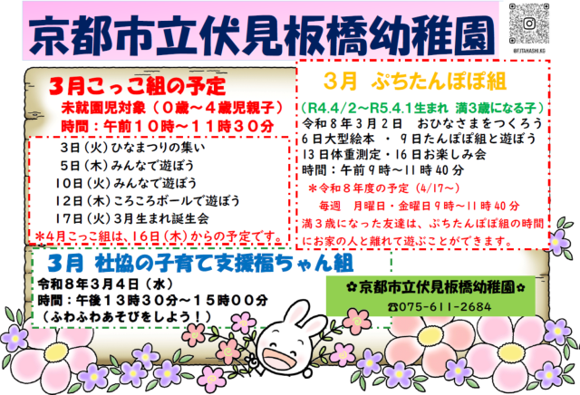 3月のこっこ組・ぷちたんぽぽ組の予定表を掲載します。令和8年度ぷちたんぽぽ組の子どもたちも募集しています。令和5年4月2日~令和6年4月1日生まれまでのお友達、どうぞ遊びに来てくださいね。お待ちしています。