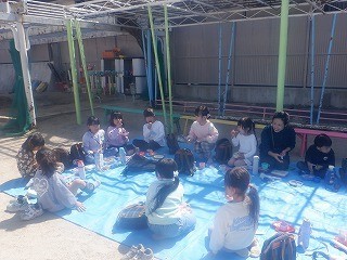 ゆり組の友達と揃ってお弁当を食べるのも、今日が最後です。せっかくのいい天気、園庭に大きなシートを敷いてみんなでポカポカ陽気を感じながらお昼ごはんを食べました。