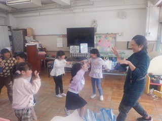 今日は気持ちのいい晴天で、年長ゆり組の子どもたちは朝からクラスのみんなで鬼ごっこをして遊びました。他にも、遊具や一輪車といった戸外での遊びをしたり、部屋の中では人形劇やコマ回しなどをしたりして思い思いに楽しい時間を過ごしました。