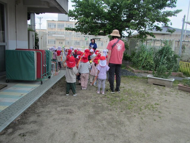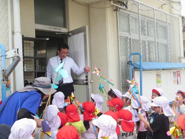 今日は、自分たちでつくった風車をもって