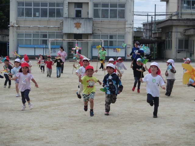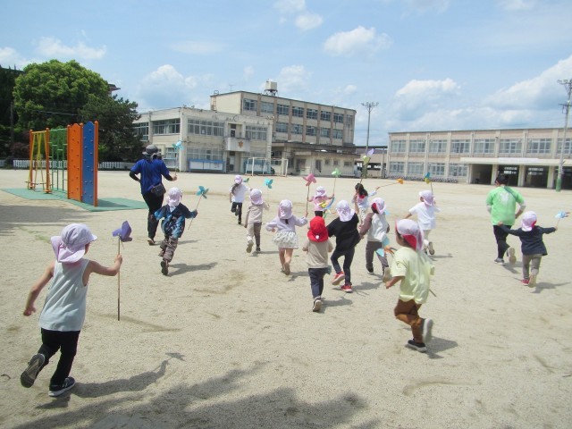 広い校庭で思い切り走り風車を回しました。