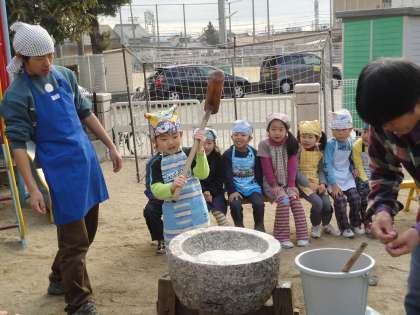 年中さんはちょっとだけ経験者。おいしいおもちになあれと気持ちをこめてつきました。一番ベテランの年長さん、さすがに上手です。力いっぱいつきました。