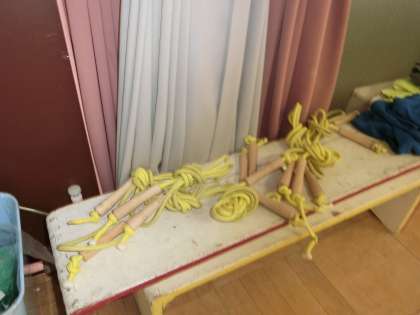 鬼ごっこのために服を脱いだ子どもたち,今度は誰に言われるともなく,きちんとたたんで,きれいに並べていました!そして鬼ごっこの前に遊んでいた縄跳びもきれいに結んで置いてありました!