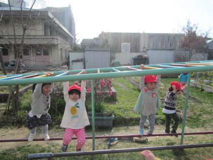 3歳児たちは,友達と一緒に『うんてい』にぶらさがり,とても気持ちのよい空を見つめていました。