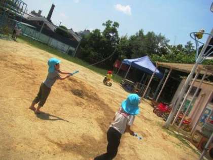 園庭では,水遊びが楽しめるように水鉄砲を用意しました。消防士さんになりきって,「火を消すぞ!!」と,友達に声をかけて放水したり,何人かと一緒に「せーの!」と息を合わせて水を出したりして遊びました。友達と一緒に水が飛び出ると,「雨みたーい!!」と大喜びでした。