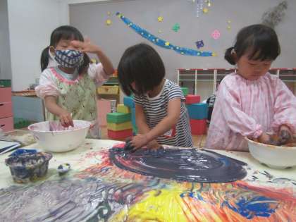 思いきり机にのりを伸ばして「つるつるする」「くにくにって気持ちいい!」と楽しみました。