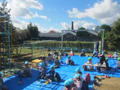 気持ちのよい秋晴れの下,にじ組とそら組の『はまっこ』でおひさま弁当をしました。「みんなで食べるとおいしいな」と話しながら一緒に食べることを楽しみました。お弁当の後は園庭でたくさん遊びました!