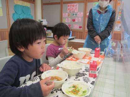 お隣の伏見南浜小学校で給食体験をさせていただきました。今日のメニューは『麦ごはん・カレー・アスパラガスのソテー・牛乳』でした。「あったかいな」「めっちゃおいしい!」と初めて食べる小学校の給食を十分に味わいました。小学校の先生ともたくさん話をして小学校への楽しみが広がりました。