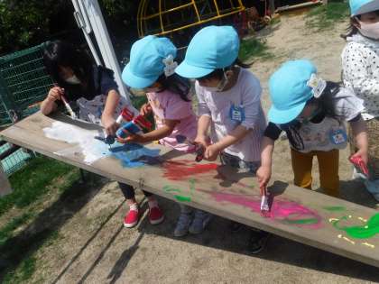 アスレチックの場に使っている板に色をつけよう!とペンキやさんをしました。