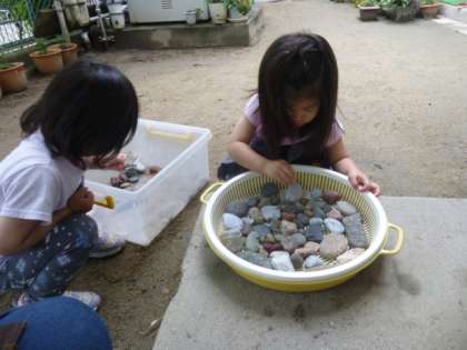 今日は色々な場所で『並べる』ことに夢中になる姿がみられました。年少児は様々な色や形の石を丸いお皿に,ていねいに並べていました。『ハートみたい!(形)』『緑もあるよ!』『ここに小さいの置いて!』とお友達との関わりも楽しんでいました。年長児はカラフルなフェルトマットを『マグマ』や『お水』・・などに見立てて,恐竜ワールドに入り込んでいました。