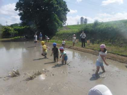 今日は,地域の方のご厚意で田んぼでどろんこ遊びをしました。心配していた天候もお天気!田んぼ日和です。