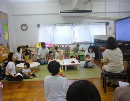 子どもの育ちにとって、かかわりたくなる、話したくなるお家の人との関係づくりがその後の言葉やコミュニケーションの育ちに大きくつながることを教えていただきました。ミニ講演会の後も保健師さんを囲み、お話しされる保護者の方の姿が見られました。同じ乳幼児をもつ保護者の方が集まり、共にお話しを聞く機会は、同じ思いや悩みを共有できる大事な場となると考えています。また次回も企画したいと思っています。またぜひご参加ください。