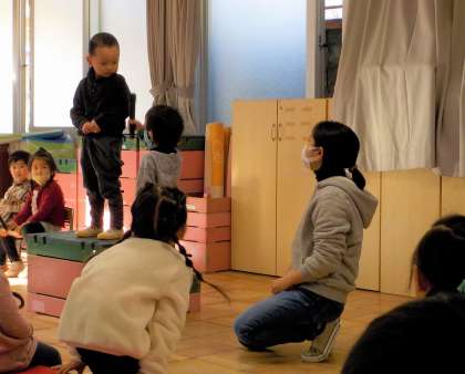 年長児の司会も、経験を重ね堂々としてきました。友達へのインタビューも、相手の好きなことを聞いたり、小さい友達にはわかりやすい質問をしたりするなど、それぞれが相手を思っていることがよくわかりました。お祝いされる子どもたちは嬉しそうな恥ずかしそうな何とも言えない姿がとてもかわいらしかったです。