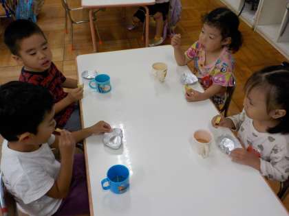 切られたおいもの中の色を見たり、ホットプレートで焼いていくのを見たり,おいものおいしい匂いを感じたりしました。「いいにおいがするね。おいもの匂いだ!」と焼かれているおいもを見て、子ども達は大喜びでしたよ。