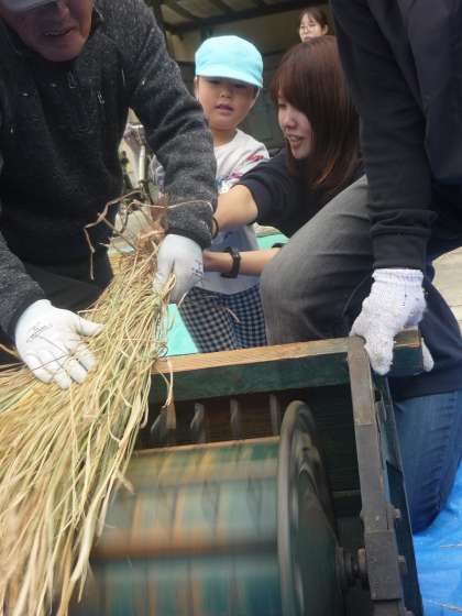 学校に保管してある昔の脱穀機などを用意してもらい、一人ずつ脱穀の体験をさせていただきました。