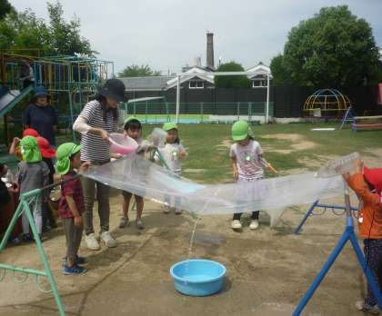 先生たちは、この時期ならではの水遊びができるように環境を用意します。