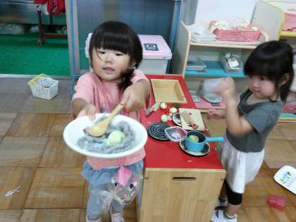 中央:先週からままごとあそびのご飯作りに登場している本物のチビチビ玉ねぎです。皮をむいて、包丁で切ってスープや炒め物をごちそうしてくれています。