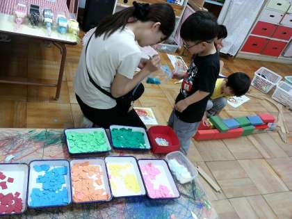 右側:七夕飾りにと、金魚作り…。色を選んで透明袋に入れ、スズランテープの色も自分で選びます。出来あがると色んな場所にお出かけし、何人かでやりとりしながらあそびが始まっていきます。しばらくは、梅雨(雨)をたのしんでいきたいと思います。