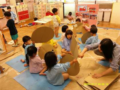 スモックに着替えることにも少し慣れてきたはな組のこどもたちです。はじめは「しない。」と言っていても、遊んでいる友達の楽しそうな様子を見て、慌てて着替えはじめるのでした。今回は丸と四角の段ボールを選ぶことからスタートしました。好きな形を選んだことで「これは自分のもの!」とそれだけでウキウキしたうれしい気持ちになったようです。絵具の色は、各種用意した色に加え、「あかほしい。」「しろちょうだい。」「わたしもー。」と、リクエストに応えるかたちでも色を足していきました。ローラーや手や足も使ってとても賑やかでカラフルな絵の具あそびの時間となりました。