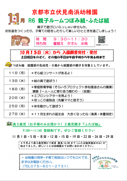 現在幼稚園では、入園願書交付・受付を行っています。入園をご希望の方は、伏見南浜幼稚園までお越しください。心よりお待ちしています!