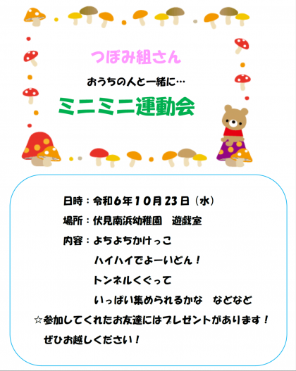 土曜日は雨が降り、残念ながら参加できなかったつぼみ組さん、23日(水)に遊戯室でミニミニ運動会を行います。土曜日に来てくれたお友達も、内容が少し違いますので、ぜひぜひもう一度お越しください!おうちの人と一緒に楽しみましょう!