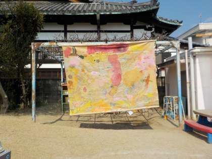 はな組みんなでつくった大きな山…。いい天気の下、今日のお弁当前、突如園庭に現れました。リュックを背負ってみんなでお出かけです。「やったぁー。」と準備もあっという間にOKとなりました。「ピクニック久しぶりやなぁー。」と、前の経験を思い出しているこどもたちもいました。今日は風もあったので、お山(大きな用紙)が大きく揺れることにも気が付き、「うわー!」と歓声があがっていました。色んな場面がみんなにとって楽しい時間になっていました。何よりお腹がペッコペコになったところでのお弁当はとっても美味しかったことと思います。