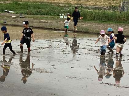 以前から、「早く行きたい!生き物いるかな」と楽しみにしていた子どもたち。早速、田んぼの中に入ってかけっこや泥合戦、生き物探しなどを楽しみました。