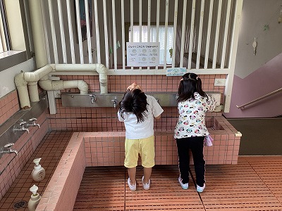 その後、昼食後の手洗い場では「さっきばい菌の話してたから!」とうがいをしている子どもたちの姿がありました。
