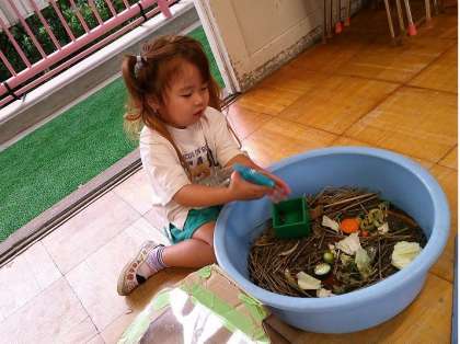 雨上がりの土の上に、ダンゴムシがたくさん集まっていて,今日もダンゴムシ探しを楽しみました。こうして、毎日誰かがダンゴムシ探しをしており、にじ組のダンゴムシのお家は、仲間が増えてきています。またダンゴムシのために野菜を持ってきてくれる友達もおり、ニンジンやキュウリを食べる様子を見ています。土が乾くと霧吹きで雨を降らせるのも、いろいろな子どもが気づいてしてくれるようになりました。