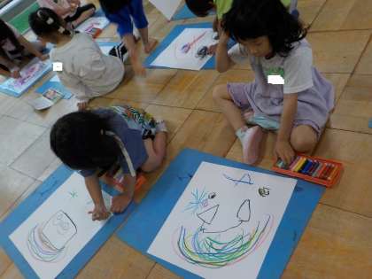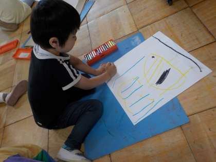 ダンゴムシに親しんでいる今、子どもたちはどのようにダンゴムシを表現するかな?と思い、クレバスで描いてみることにしました。ダンゴムシをドーンと大きくかく子どももいれば、ぐるぐる描きをして「ダンゴムシが転がってる〜」と話す子ども、「お家をつくってあげるの」とかく子ども…いろいろな表現があり、楽しい時間となりました。