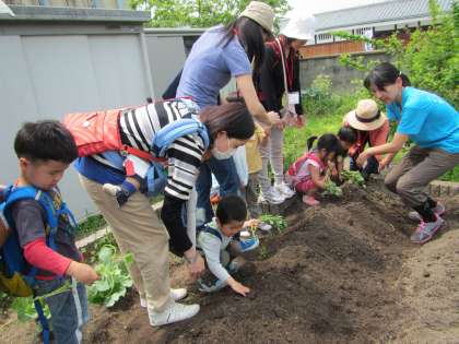 今日は3歳児クラスの子どもたちと保護者の方とで、サツマイモの苗(茎)を植えました。保護者の方も「こんなのから、おいもができるんですね〜」と驚きの声があがっていました。