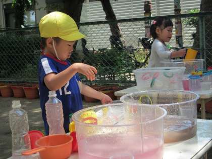 こどもたちは、いろいろな色の水をすくって、流したり、色の混ざる様子を見たりしていました。また、ジュースに見立て遊んだりすることも楽しんでいました。