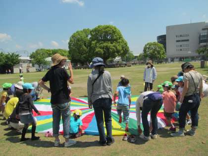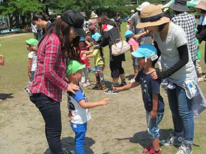 みんなで記念撮影をしたり、3・4・5歳児が4つの縦割りグループを作って、『じゃんけん列車』や『バルーン遊び』『しっぽとり』『おかあさんいすとりゲーム』などを楽しみました。こどもたちにとっては、いつも幼稚園でしている楽しい遊びを保護者の方々と一緒にできて、楽しさも倍増!していたようです。また今まであまりかかわりのなかった、他の学年の保護者の方どうしの会話もはずみ、楽しいひと時となりました。