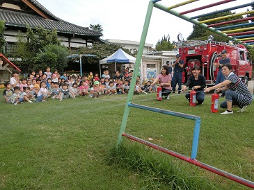 先生たちが、消火訓練に取組む様子を見て、子どもたちも一生懸命応援してくれていました。