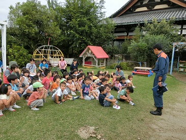 9月26日・・毎月1回行っている避難訓練の日でした。しかしこの日は“特別”で、南浜消防出張所から、消防車がやってきました。また地域の消防分団の菅野団長をはじめ、多くの方が応援に駆けつけてきたくださいました。